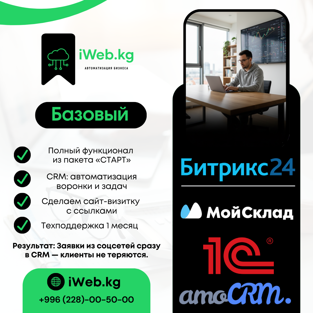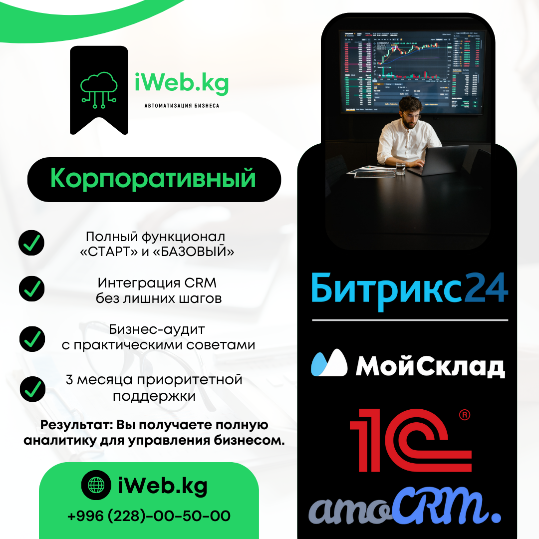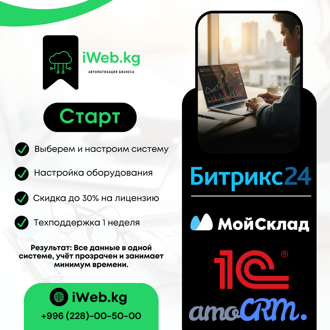 iWeb.kg внедряет МойСклад, Bitrix24, amoCRM и 1С. Настраиваем сайты, продажи и аналитику — все в единой системе, доступной онлайн из любой точки мира.
